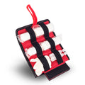 • Pieza de sistema de gancho y bucle rojo extraíble para identificar el asa de apertura principal.